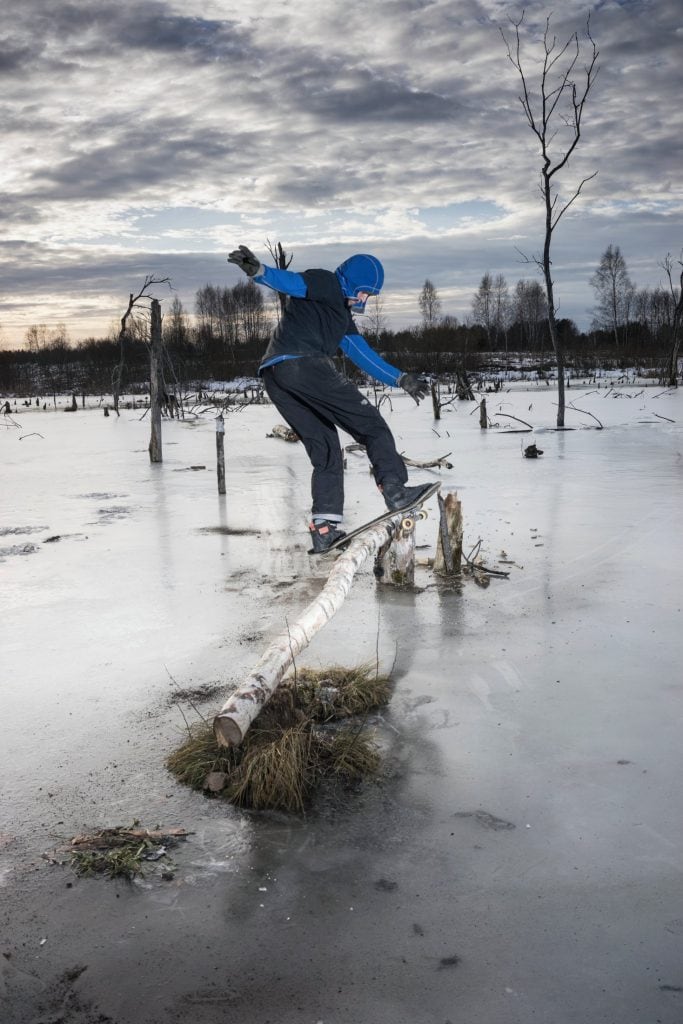 Техника подготовки напоминает кастомный продакшн. Если нужен гладкий разгон, Илья проливает воду и ждёт, пока поверхность замрёт зеркалом. Если хочется сцепления, рассыпает золу из печи или мелкий песок. Цепной пилой он подрезает ступени и грани, древесными ветками укрепляет борта. Комплект подстраивается под климат: зимний наждак, смазанные морозоустойчивой смесью подшипники, колёса средней жёсткости. Всё звучит как инструкция по выживанию, но на деле это безысходная практика: хочешь катать зимой — учись приручать материалы, которые есть под рукой.