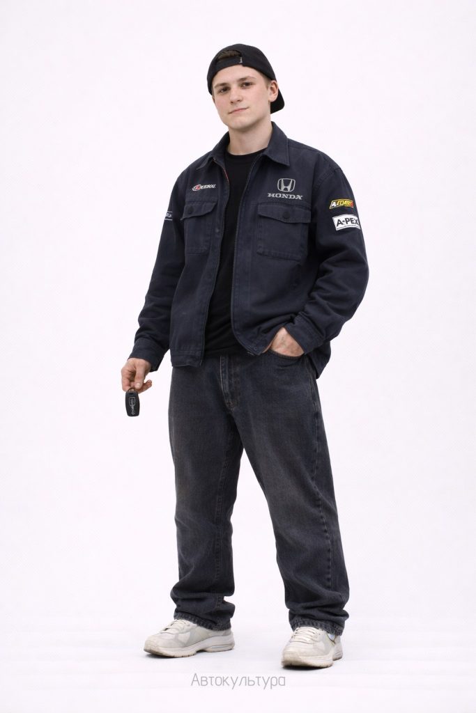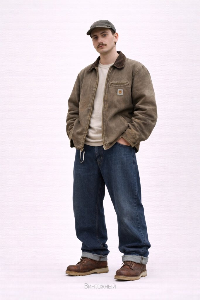 Куртка Carhartt Detroit — обязательно потёртая, новая не считается. Широкие прямые джинсы с подворотом. Рабочие ботинки Red Wing или аналоги. Старая кепка без современных логотипов. Карабин на петле ремня. Усы или борода — не обязательно, но органично.