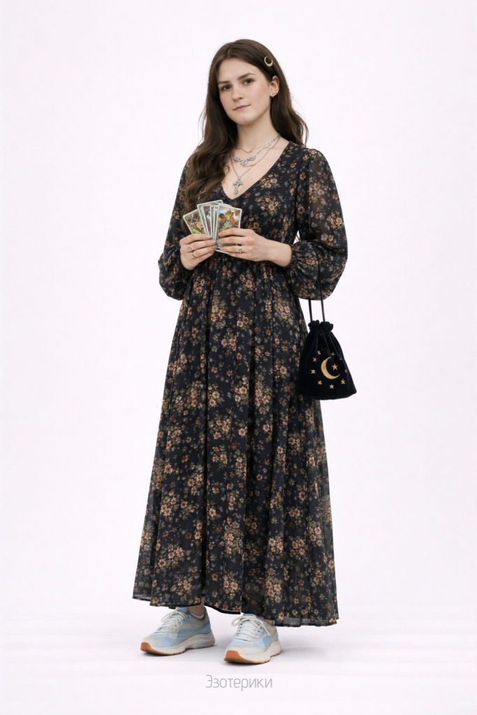 Кристаллы и камни как украшения. Колода таро — обязательный атрибут. Луна, звёзды и оккультная символика в одежде. Свечи, травы, алтари дома.