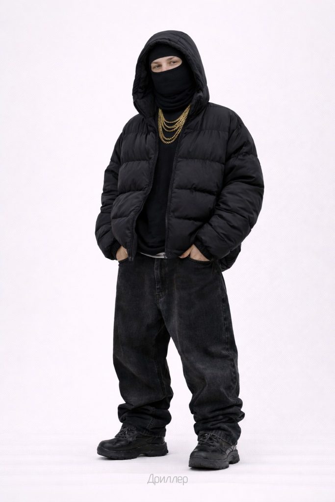 Балаклавы и маски — часто как визуальный элемент. Мешковатые штаны очень низко, длинные футболки, пуховики. Много цепочек. Тёмные оттенки. Лица часто скрыты — анонимность как эстетика.