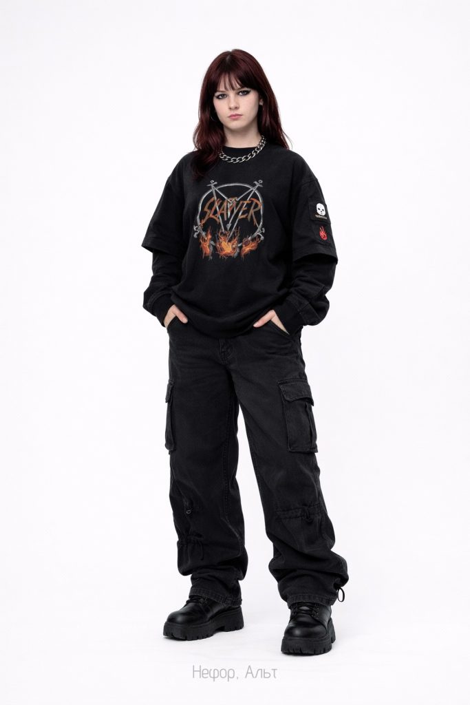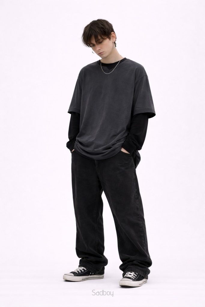 Слоистые образы: лонгслив под футболкой, широкие джинсы, цепочки, кольца. Чёлка, укладка. Близко к скейт-эстетике.