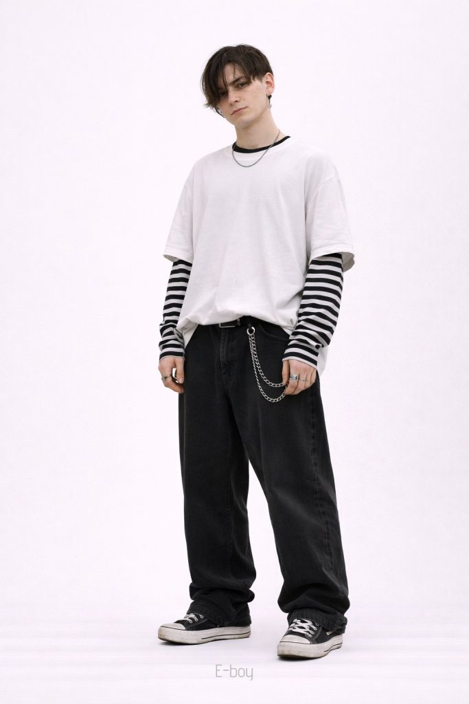 Тёмные цвета, оверсайз, цепочки, платформы, нашивки, цветные пряди. E-girl: румяна на носу, аниме-принты, hair clips. E-boy: лонгслив под футболкой, широкие штаны, кольца, чёлка.