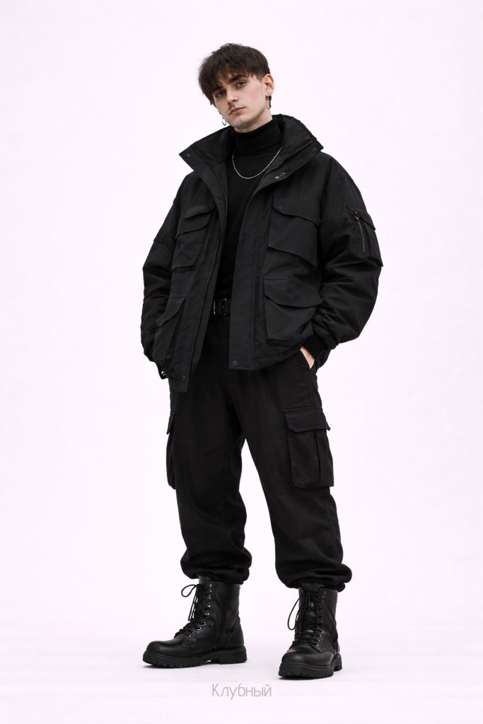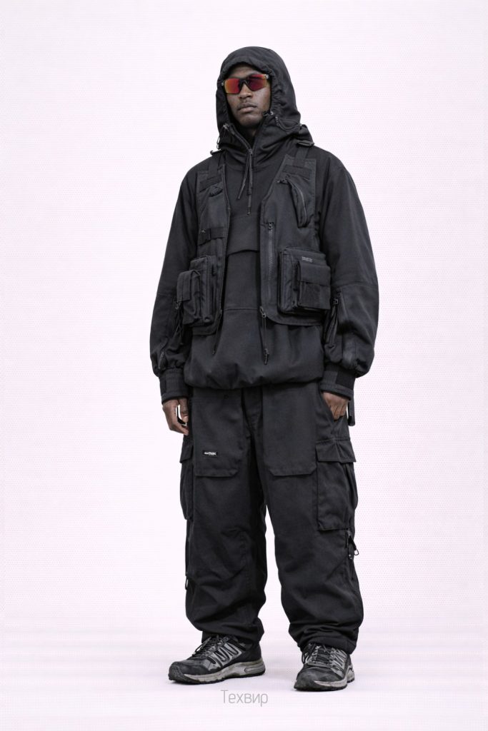 Две смежные эстетики, которые часто смешиваются в одном человеке. Горпкор — культ технологичной outdoor-одежды как городской моды: флиски Patagonia, куртки Arc’teryx, треккинговые ботинки на асфальте. Техвир — более футуристичная ветвь: тёмные технологичные ткани, карго с карманами, урбанистическая функциональность.
