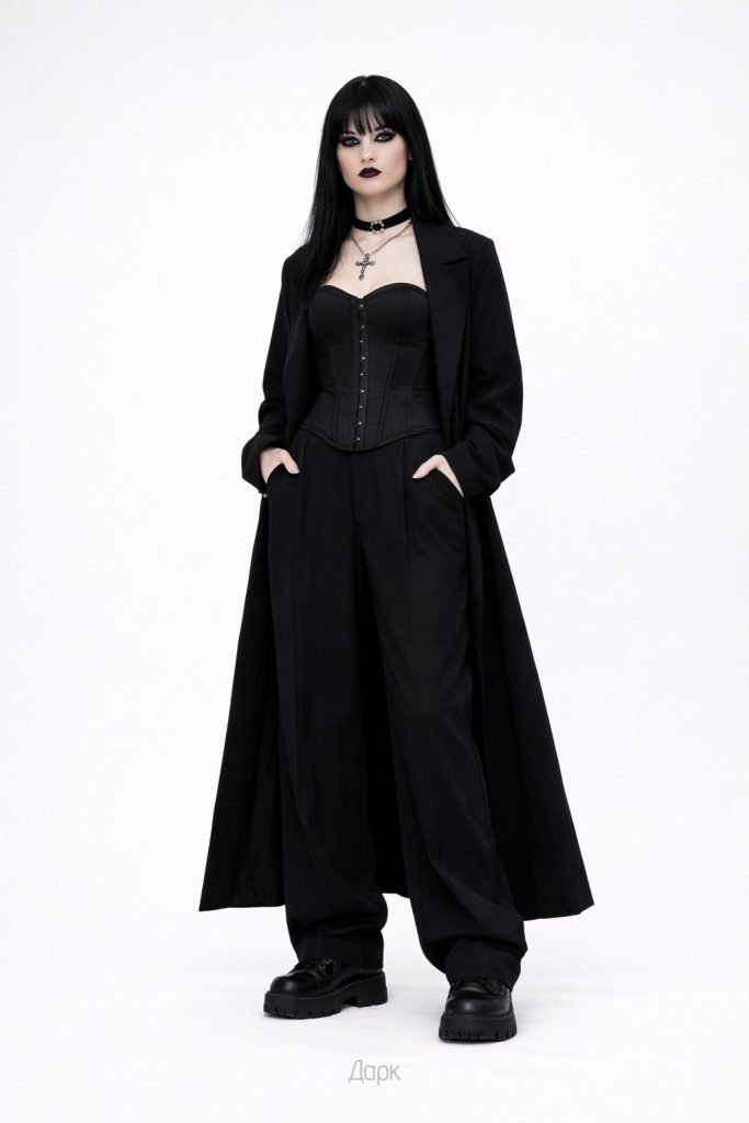 Всё чёрное или почти. Массивная обувь, длинные плащи, чокеры, кресты и оккультная символика. Бледная кожа как идеал. У готов — подводка и белая пудра как обязательные элементы.