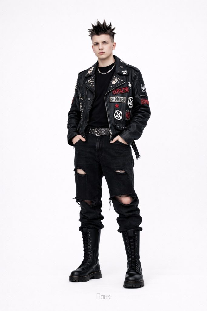 Кожаные куртки с нашивками, заклёпки, рваные вещи, боты Dr. Martens. Принципиальный DIY: всё своё, самодельное, из секонда. Ирокез реже, чем принято думать — это уже почти карикатура на субкультуру.