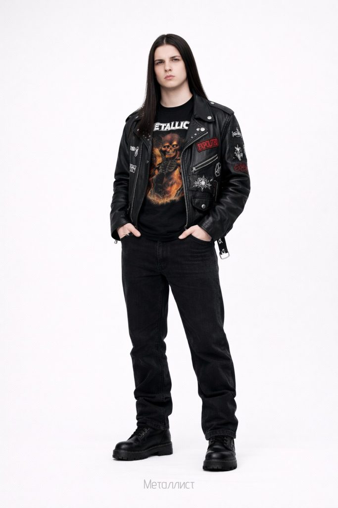 Чёрные футболки с логотипами групп — обязательно. Джинсы, длинные волосы как традиция. Кожаная куртка с нашивками — «косуха» — высший уровень принадлежности, цепи, пиво.
